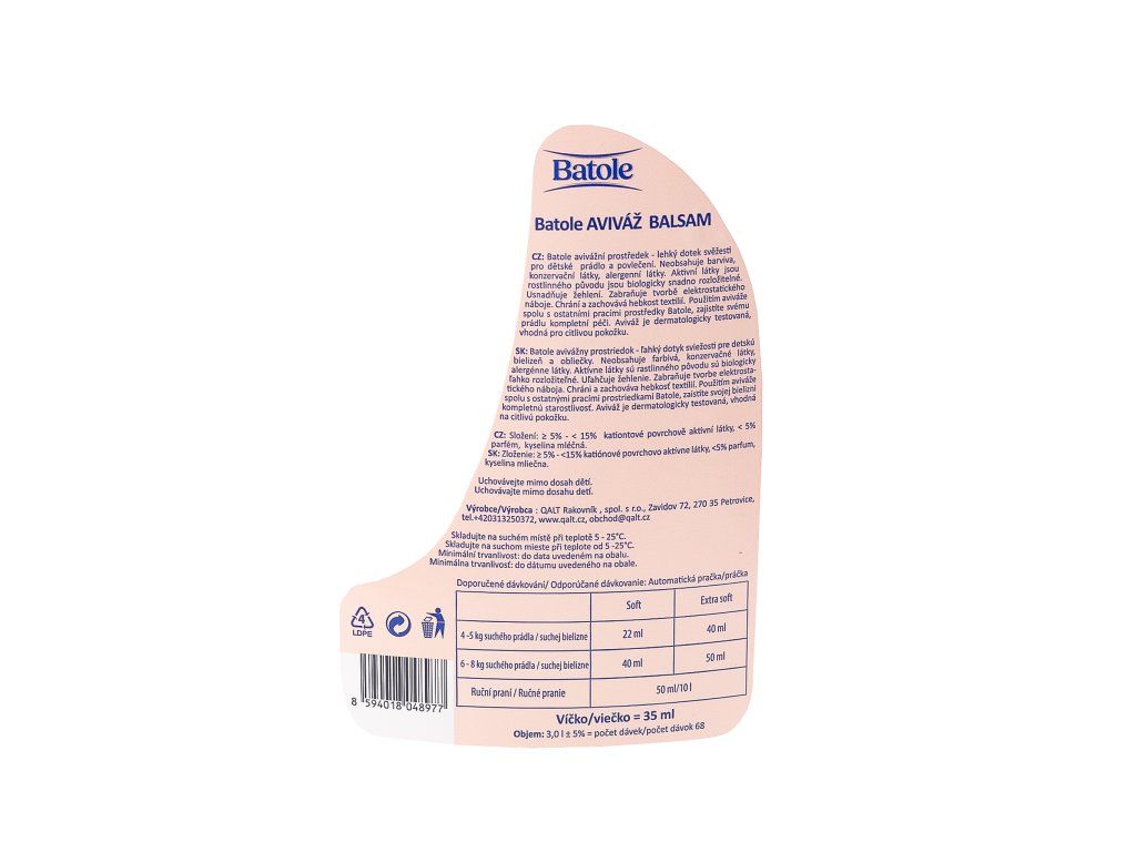 Nová aviváž Batole Balsam zanechává prádlo příjemně měkké na dotek a dodává mu čistou, lehkou vůni. Díky své účinnosti stačí malé množství pro dosažení perfektního výsledku.