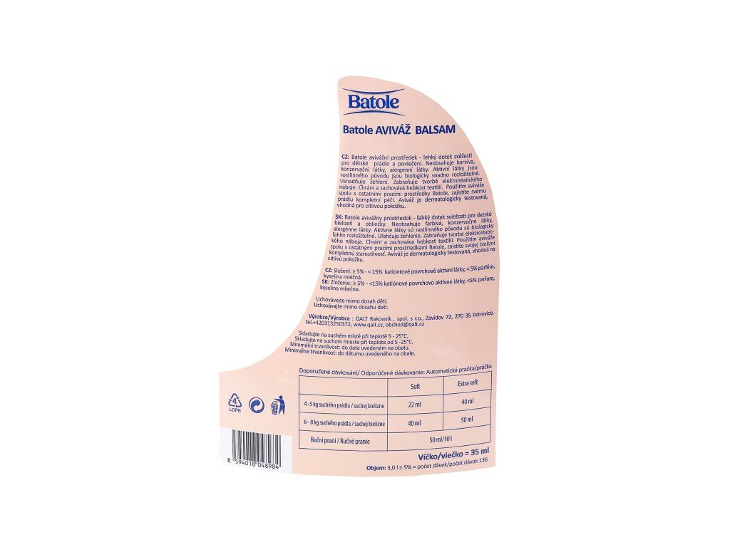 Dopřejte svému prádlu hebkost, svěžest a šetrnou péči s aviváží Batole Balsam. Tento kvalitní avivážní prostředek je navržen s ohledem na citlivou pokožku, a proto je ideální nejen pro dětské oblečení, ale i pro každodenní prádlo celé rodiny. Dermatologicky testováno.