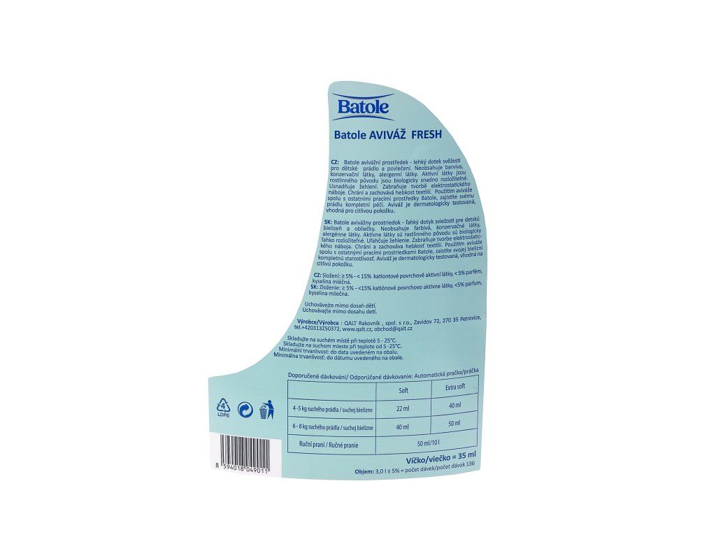 Nová aviváž Batole Fresh zanechává prádlo příjemně měkké na dotek a dodává mu čistou, lehkou vůni. Díky své účinnosti stačí malé množství pro dosažení perfektního výsledku.
