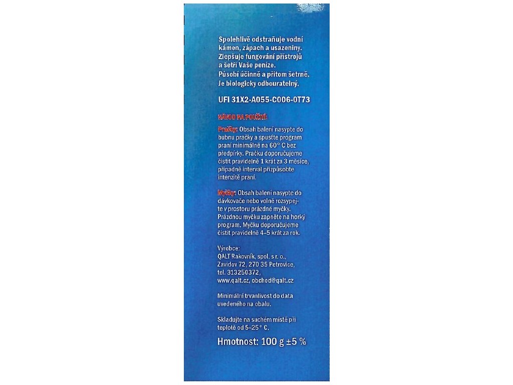 Čistič praček a myček Qalt spolehlivě a účinně odstraňuje vodní kámen, zápach i veškeré usazeniny v pračkách a myčkách.