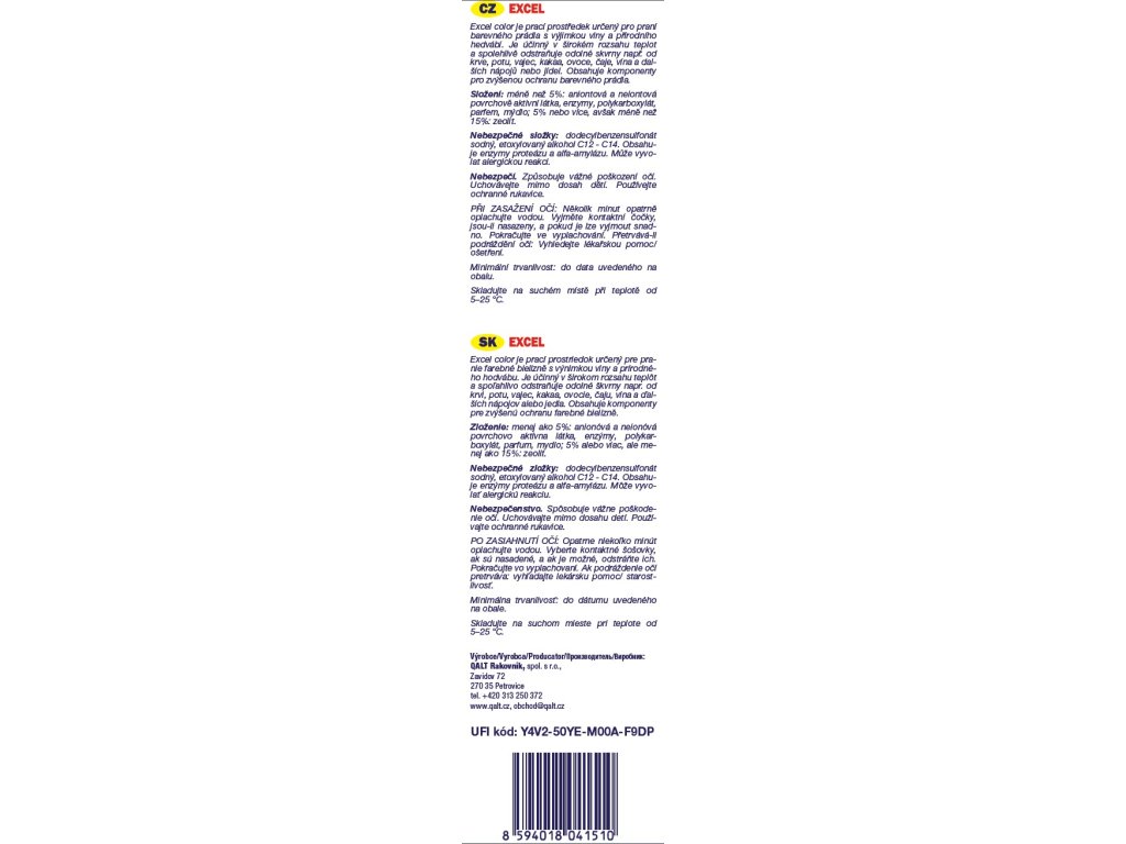 Koncentrovaný prací prostředek Qalt Excel Color je určený zejména pro praní barevného prádla. Obsahuje aktivní komponenty pro zvýšenou ochranu zářivých barev vašeho oblíbeného prádla.