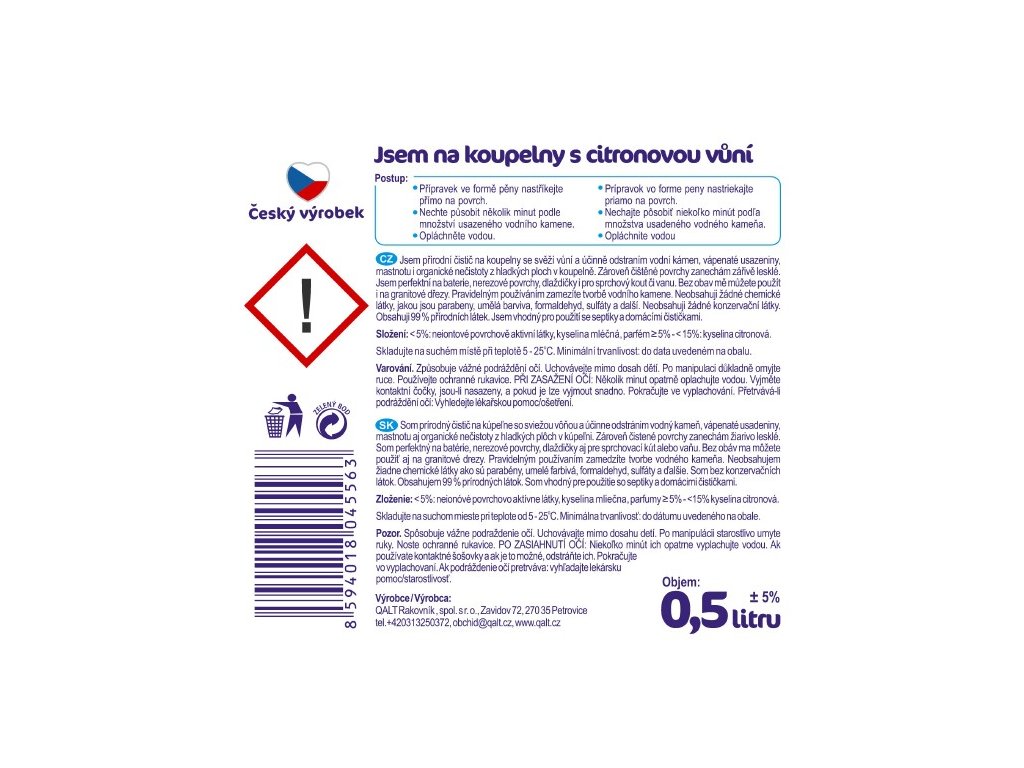 Jsem přírodní čistič na koupelny se svěží vůní a účinně odstraním vodní kámen, vápenaté usazeniny, mastnotu i organické nečistoty z hladkých ploch v koupelně.