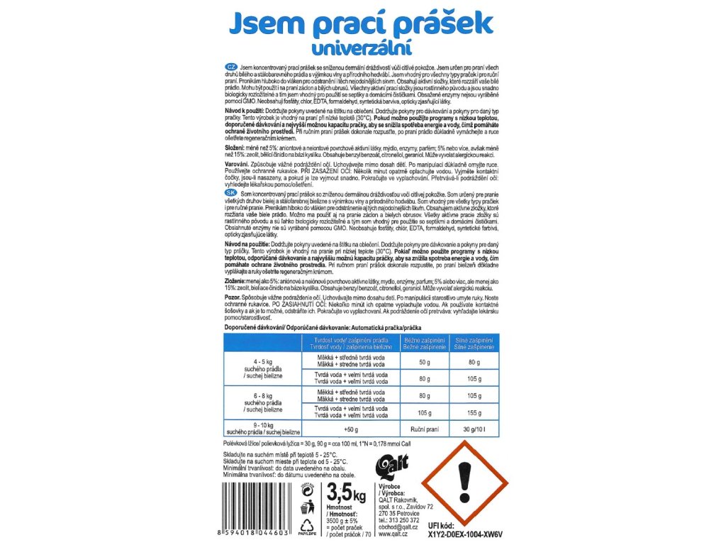 Jsem koncentrovaný prací prášek se sníženou dermální dráždivostí vůči citlivé pokožce. Jsem určen pro praní všech druhů bílého a stálobarevného prádla s výjimkou vlny a přírodního hedvábí. Jsem vhodný pro všechny typy praček i pro ruční praní. Pronikám hluboko do vláken pro odstranění i těch nejodolnějších skvrn. Obsahuji aktivní složky, které rozzáří vaše bílé prádlo. Mohu být použit i na praní záclon a bílých ubrusů.