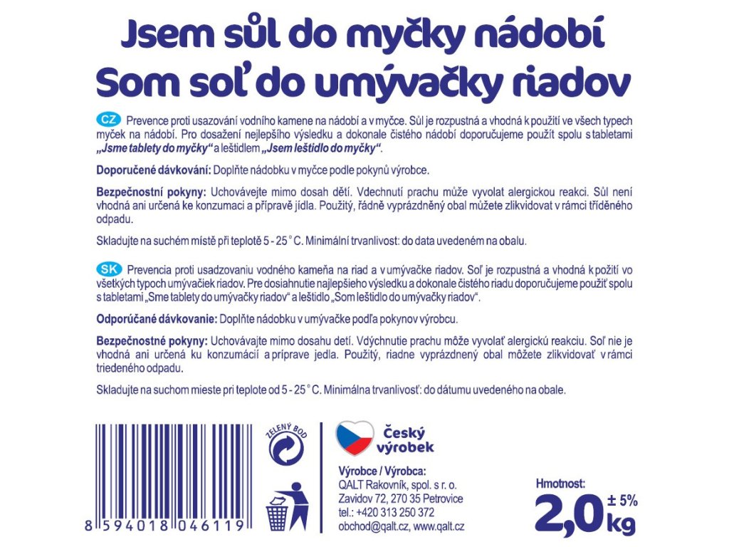 Prevence proti usazování vodního kamene na nádobí a v myčce. Sůl je rozpustná a vhodná k použití ve všech typech myček na nádobí. Pro dosažení nejlepšího výsledku a dokonale čistého nádobí doporučujeme použít spolu s tabletami „Jsme tablety do myčky“ a leštidlem „Jsem leštidlo do myčky“.
