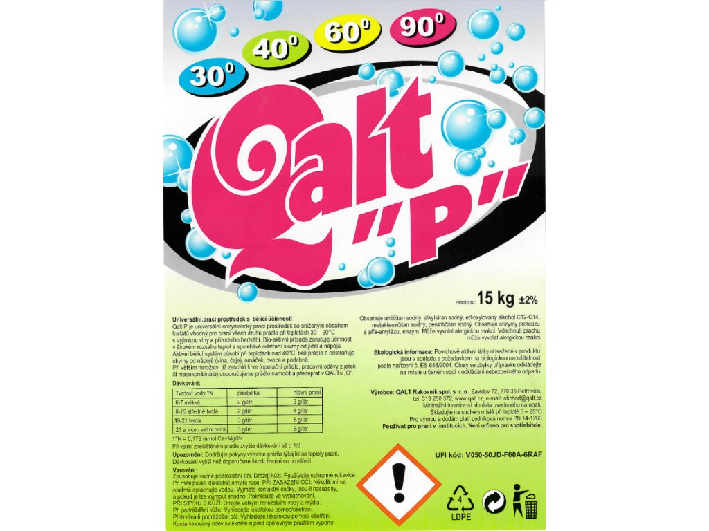 Qalt P je universální enzymatický prací prostředek se sníženým obsahem fosfátů vhodný pro praní všech druhů prádla při teplotách 30 - 90 °C s výjimkou vlny a přírodního hedvábí.